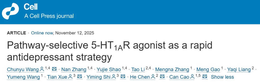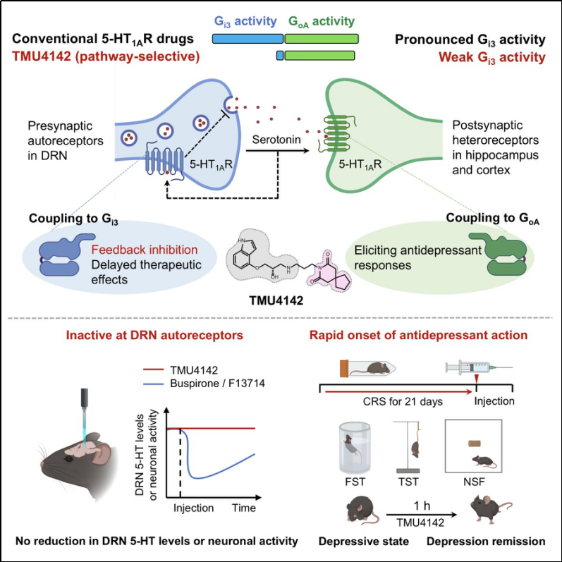 2025年11月12日,合肥综合性国家科学中心大健康研究院、免疫应答与免疫治疗全国重点实验室、中国科学技术大学生命科学与医学部曹灿教授课题组与中国科学技术大学生命科学与医学部薛天教授课题组以及天津医科大学陈贺特聘研究员课题组联合研究团队,在Cell杂志发表题为“Pathway-Selective 5-HT1AR Agonist as a Rapid Antidepressant Strategy”的研究文章。该研究提出了一种基于5-HT1A受体信号通路选择性的快速抗抑郁新策略,并据此理性设计出候选化合物TMU4142。实验结果显示,TMU4142在抑郁小鼠模型中展现出显著的快速抗抑郁样效果。该策略直击临床上选择性血清素再摄取抑制剂(SSRIs)类抗抑郁药物普遍存在的起效缓慢难题,为新一代快速抗抑郁药物的研发提供了崭新的思路和可行路径。