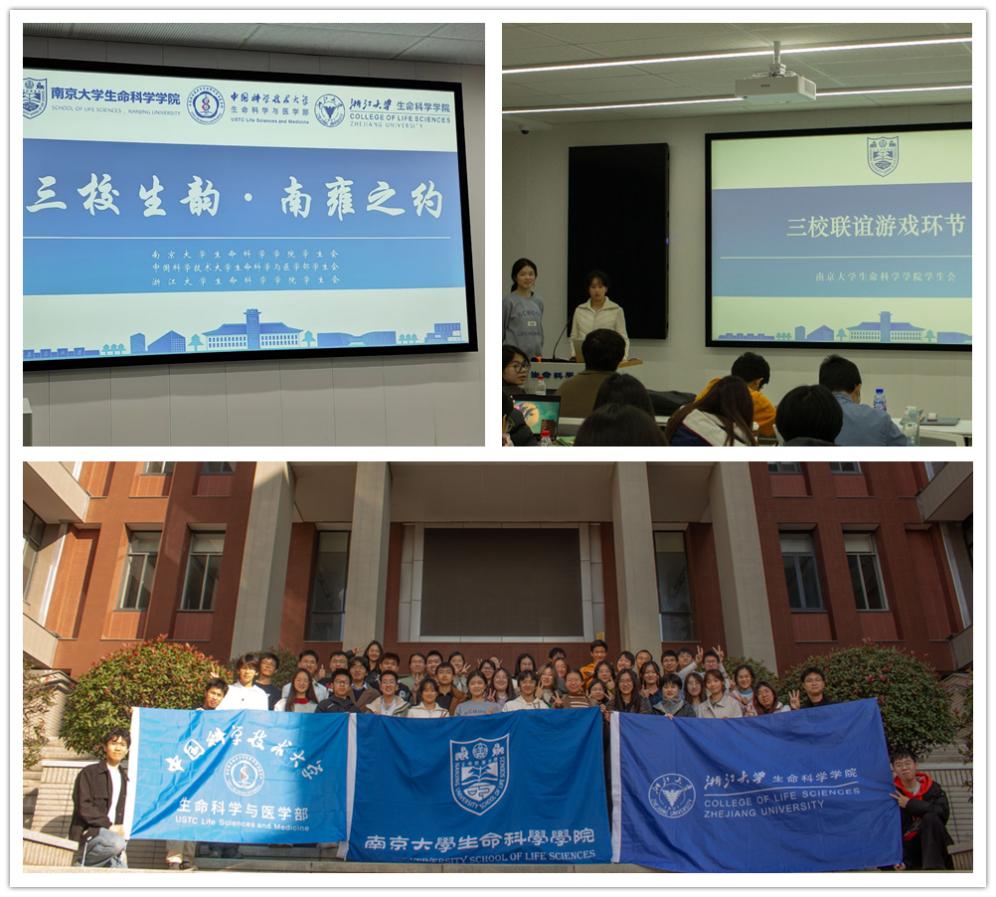 为促进校际学生组织交流,拓宽学术视野、推动文化互鉴,近日,中国科学技术大学生命科学与医学部学生会携手南京大学生命科学学院学生会、浙江大学生命科学学院学生会共同举办了三校联谊交流活动。本次活动以“互学互鉴、协作共进”为主题,通过实地参访、座谈研讨、文化体验等形式,搭建起跨校沟通与合作的有效平台。11月30日上午,中国科学技术大学生命科学与医学部学生会代表抵达南京大学仙林校区,与南京大学、浙江大学两校生命科学学院学生会成员会合。在南京大学同学的带领下,三校代表一同参观了生命科学大楼并合影留念。南京大学同学系统介绍了学校的发展历程、学科优势与校园文化,让与会同学深入领略到其“诚朴雄伟、励学敦行”的学术风气。