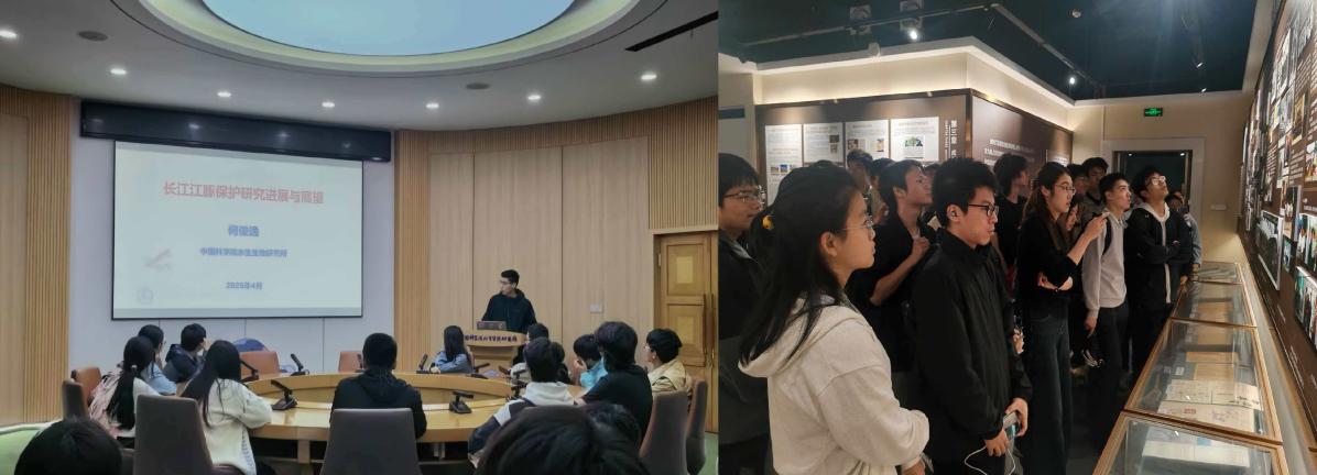 当日下午,师生前往中国科学院水生生物研究所开展研学。在工作人员引导下,大家深入了解研究所的光辉历史,聆听为我国水生生物研究事业作出卓越贡献的科学家事迹,感悟老一辈科研工作者潜心钻研、报国为民的崇高精神。在水生生物博物馆展厅,师生依次参观白鲟、中华鲟等珍稀濒危物种标本,以及扬子鳄、长江江豚等国家重点保护野生动物标本,全面认识长江鱼类资源与水生生态系统多样性。研学期间,何俊逸老师带来“长江江豚保护研究进展”主题讲座,详细解读江豚保护现状、技术手段与保护成果;周雄冬老师以“从观测到智能:数据科学的变革与实践”为题开展分享,前沿的科学理念与创新研究思路引发师生强烈好奇与热烈讨论。现场问答环节氛围浓厚,师生踊跃提问,专家耐心解惑,为大家未来科研方向选择提供了重要启发。